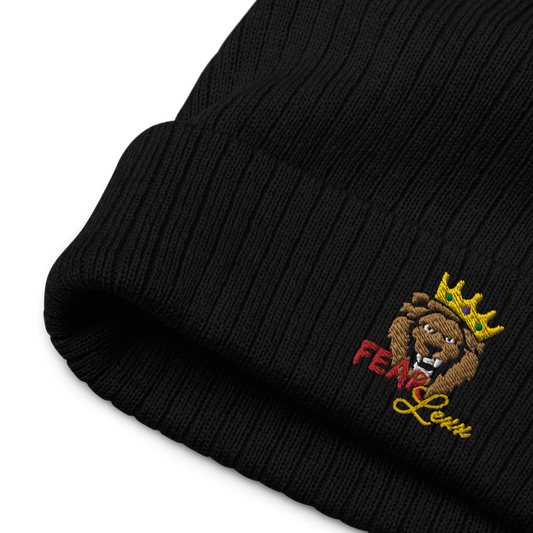 Recycled embroidered cuffed beanie "Red fear"